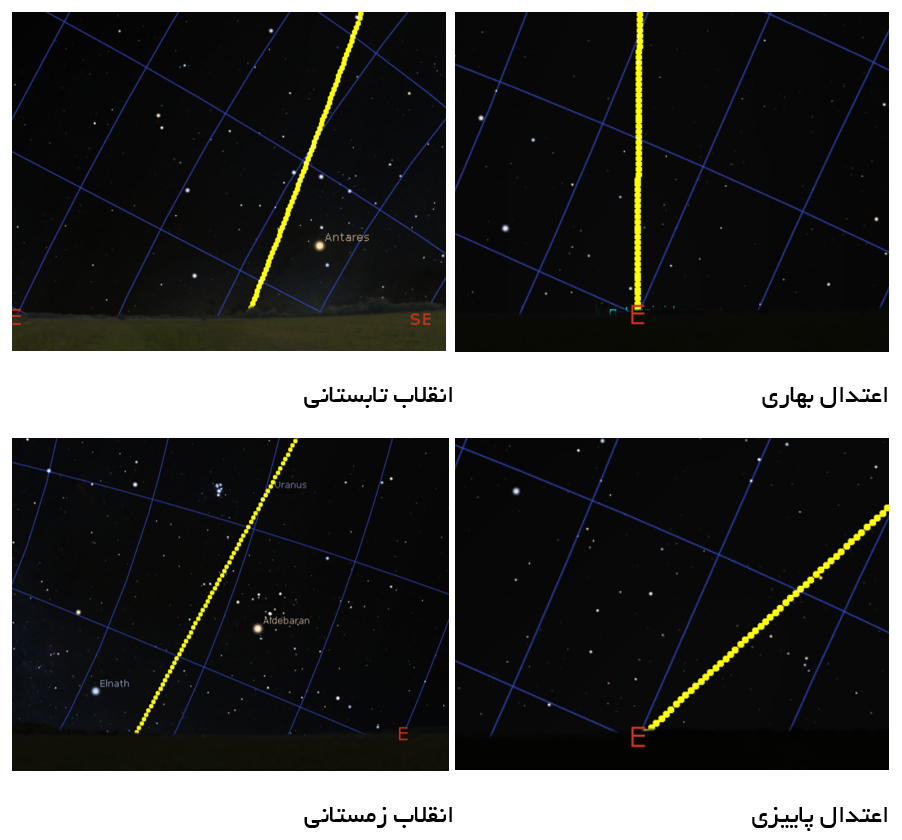 تصویر زیر برای درک بهتر این مطلب، زاویهی بین دایره البروج و افق را در اعتدالین (اوّل بهار و پاییز) و انقلابین (اوّل تابستان و زمستان) را در یک مکان نزدیک رأس السّرطان نشان میدهد. در این تصاویر شرق آسمان یعنی مکان طلوع ماه که مورد برسی ما قرار گرفته مشاهده میشود.